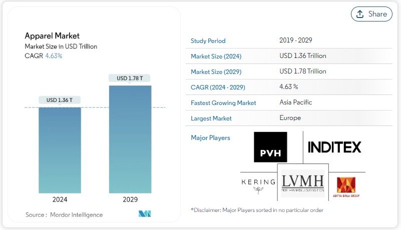 According to Mordor Intelligence, the “Apparel Market size is estimated at USD 1.36 trillion in 2024, and is expected to reach USD 1.78 trillion by 2029, growing at a CAGR of 4.63% during the forecast period (2024-2029).”